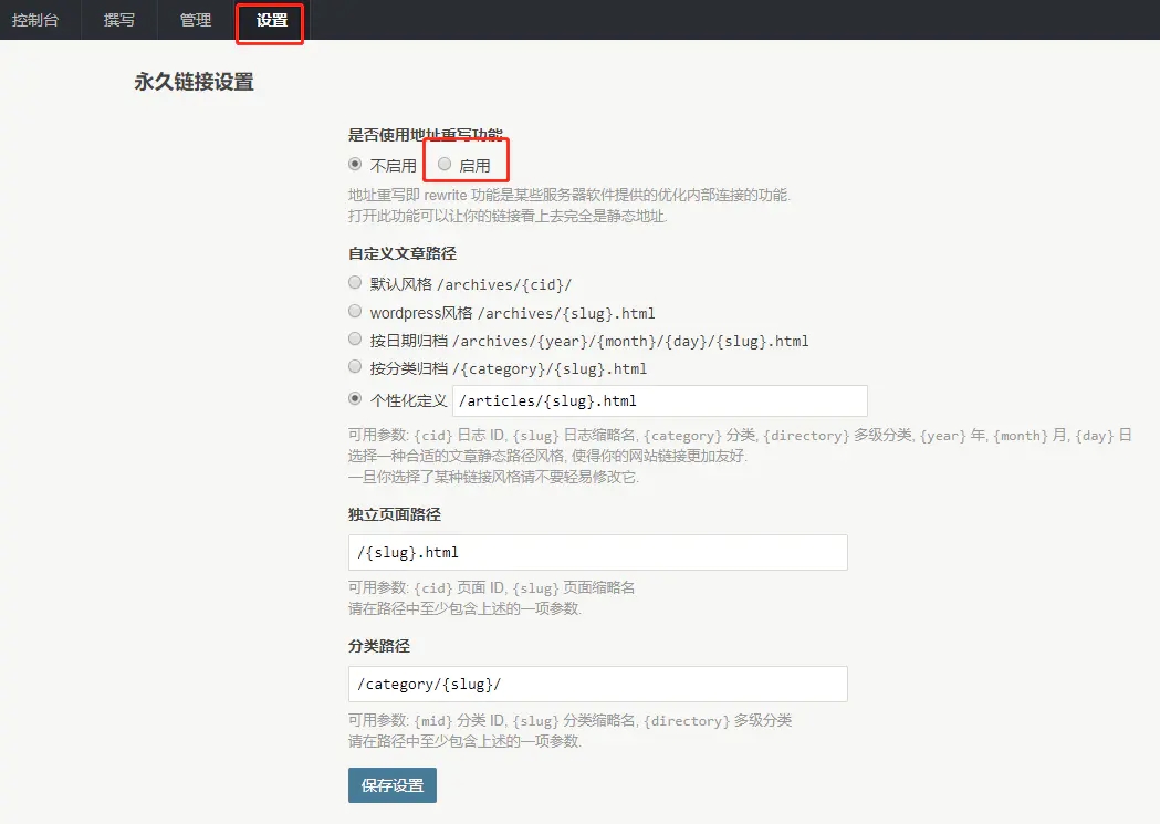 然后是typecho后台的设置,我们在“设置”-“永久链接设置”中的“是否使用地址重写功能”处勾选“启用”,然后保存。